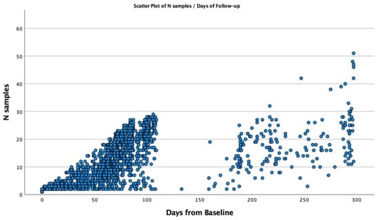 The longitudinal monitoring cohort was assembled during the Fall Semester, from 15 August 2021 to 20 December 2021, during which 8796 TERA.Bio® tests were administered. This monitoring period coincided with two significant waves of SARS-CoV-2 in Miami. The first wave, occurring primarily with the DELTA variant, transpired from 10 July 2021 to 26 October 2021, while the second wave featured the OMICRON variant of SARS-CoV-2 and extended from 1 December 2021 to 10 February 2022. In the period of longitudinal monitoring, a total of 3668 subjects actively participated in TERA.Bio® tests conducted twice weekly. Selection for participation was based on their residence hall on campus, and it was extended to encompass other students and staff who preferred not to undergo mid-nasal RT-qPCR testing. The monitoring testing was a key component in the comprehensive COVID-mitigation strategy by enabling the isolation of individuals with SARS-CoV-2 infection. Moreover, it significantly contributed to the prompt and thorough contact tracing and quarantine procedures within the campus community.