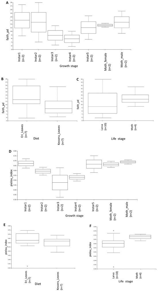 Chicago/Turabian StyleBharali, Biju, Pulakeswar Basumatary, and Utpal Bora. 2025. "Microbiome Dynamics in Samia cynthia ricini: Impact of Growth Stage and Dietary Variations" Applied Microbiology 5, no. 2: 40. https://doi.org/10.3390/applmicrobiol5020040