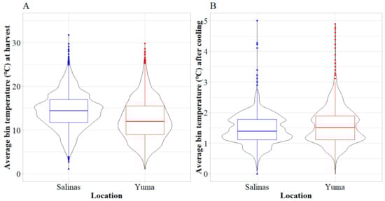 Average temperature of Romaine lettuce in the bins at harvest (A) and after cooling (B). Boxplots represent 5615 and 4623 datapoints for samples collected from the Salinas and Yuma growing regions, respectively. The median temperature of Romaine lettuce in bins at the time of harvest was 13.55 °C (min = −10.00, max = 31.77 °C).