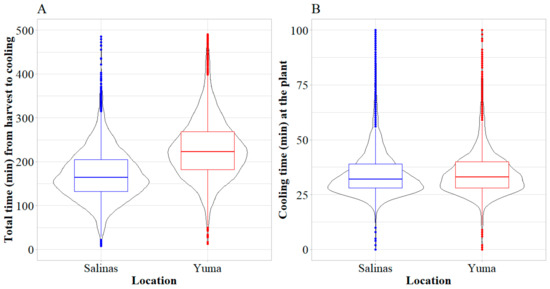 Lettuce harvested from the Salinas growing region had significantly higher median bin temperatures, 14.4 °C, than those from the Yuma growing region, 12.00 °C (p < 0.001, Mood’s median test, Figure 1A). The median temperature at the end of cooling of lettuce from the Salinas region was 1.38 °C, which was statistically different from that of the Yuma region, which was 1.50 °C (p < 0.001, Mood’s median test, Figure 1B). The time from the end of harvest to the start of cooling is called the cut-to-cool time. The cut-to-cool time for Romaine lettuce harvested from the Salinas growing region (163 min) was significantly lower (p < 0.001, Mood’s median test) than that for lettuce from the Yuma growing region (232 min), see Figure 2A. While statistically different (p < 0.001, Mood’s median test, Figure 2B), the median time taken to cool Romaine lettuce from the Yuma growing region was 33 min, which similar to that from the Salinas growing region at 32 min.