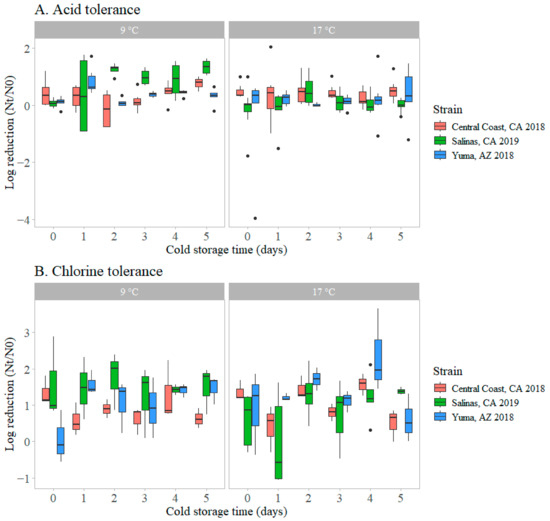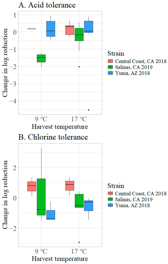 Boxplots representing (from top) change in log reduction of culturable cells due to (A) exposure to pH 2.5 for 2 h, and (B) exposure to chlorine for 30 s. X- axis shows harvest temperature. Y- axis shows change in reduction in log CFU/g. Solid boxplots represents 25th and 75th percentile of the data. Outliers are shown by solid dots. Each boxplot represents one strain with at least three biological replicates and two technical replicates.