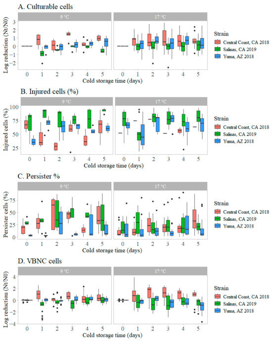 Boxplots representing culturable cells (A), injured cell percentage (B), persister cell percentage (C), and VBNC cells (D) during 5 days of cold storage. Culturable cells and VBNC cells are shown as reduction (log CFU/g), and persister cells, and injured cells are shown as percentages (%) on Y-axis. Solid boxplots represent the 25th and 75th percentile of the data. Outliers are shown by solid dots. Each boxplot represents one strain with at least three biological replicates and two technical replicates.