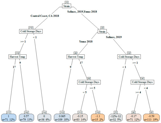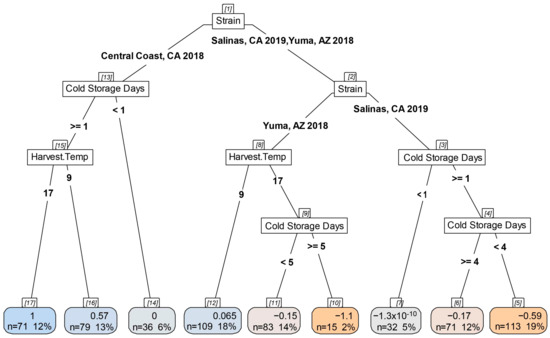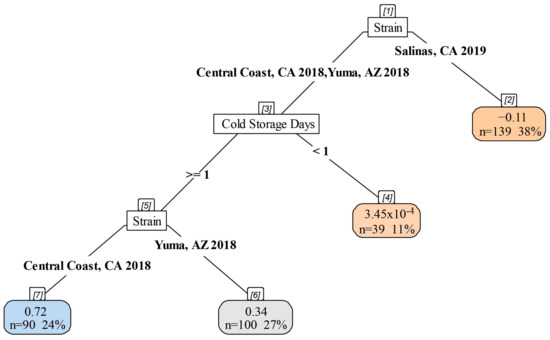 To assess the effect of harvest temperature, cold storage days, strains and their interactions on log reduction of culturable cells, a regression tree analysis was used. Optimal pruning of the tree was performed using a defined complexity parameter (CP), known to determine how deep a tree will grow, and cross-validation error (xerror): a CP that minimized the xerror was selected to optimally account for explained variance. The tree had three splits optimally explaining the variance of culturable cells during cold storage (CP = 0.01, xerror = 0.856). While regression trees have the disadvantage of variation in the splits, bootstrapping (n = 100) was used to minimize variation in establishing the most important factors explaining variance in the culturable cells. Number of cold storage days accounted for 56.1% of the variance and was the most important factor explaining the reduction in culturable cells (Figure S5). Regardless of the harvest temperature, lettuce inoculated with the Central Coast 2018 outbreak strain and stored for >1 day averaged the highest log reduction (0.72 log CFU/g, probability = 0.24), followed by the Yuma 2018 outbreak strain in cold storage for same time (0.34 log CFU/g, probability = 0.27); see Figure 6. The lowest log reduction was reported for the Salinas 2019 outbreak strain regardless of storage time (−0.11 log CFU/g, probability = 0.38).