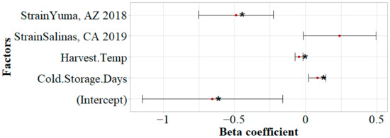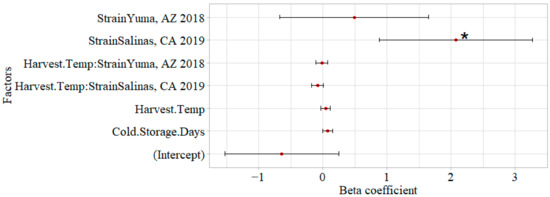 Beta coefficients from beta regression model evaluating the effect of strain, harvest temperature and cold storage period on injured cells. Statistical significance (*) was established when the confidence interval was not equal to zero and the computed effect size of the model (R2) was 0.236. The baseline categories for strain was Central Coast, CA 2018.