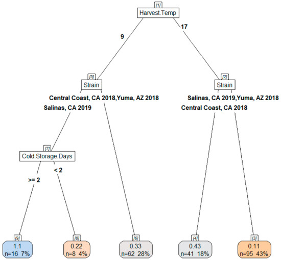 The median log reduction due to chlorine treatment increased from 0.93 (95% CI = −0.34, 1.91) on day 0 to 1.01 (95% CI = −0.00, 1.80) at 5 days of cold storage. Partial correlations accounting for the chlorine concentrations showed weak relationship between cold storage days and log reduction due to chlorine treatment at 9 °C (0.08) and 17 °C (0.19). ANCOVA analysis with chlorine concentration as a covariate showed that harvest temperature and strain did not significantly (p > 0.05) affect the log reduction due to chlorine treatment (Figure S8). The effects of harvest temperature, strain and cold storage with chlorine concentration as a covariate were assessed using regression trees (Figure 12). Produce that was inoculated with outbreak strains Salinas 2019 and Yuma 2018 and stored for >2 days in cold storage after chlorine washing (>20 ppm) had the highest log reduction (1.8, probability = 0.07). Produce that was stored for ≥2 days in the cold had higher log reduction than that stored in the cold for <2 days. Concentration of chlorine (41.9%) and cold storage days (31.3%) accounted for the highest variance in the change in log reduction due to chlorine treatment (Figure S5).