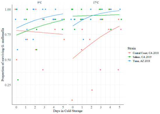 Regression methods were used to assess the combined effect of harvest temperature, strain and cold storage days on the percentage of injured cells. Different combinations of factors were incorporated into regression models, and the best fitting combinations were selected using the corrected Akaike Information Criterion (AICc). The selected model inputs were evaluated for their effect on the injured cells. Strain significantly (p < 0.001) affected the transition to injured cells during cold storage (Figure 7). In the Salinas outbreak strain, significantly (p < 0.05) more cells transitioned into injured cells than in the Central Coast strain.