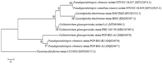 Sequencing of the ITS region gene showed that the PCP-B02-A2 strain was identified as Colletotrichum gloeosporioides with 100% identity (GenBank database accession number OQ824978). Meanwhile, the PCP-B03-A1 strain was identified as Pseudopestalotiopsis camelliae-sinensis and the PCP-B02-B2 strain was Pseudopestalotiopsis chinensis with 100% identity, with accession numbers OQ824977 and OQ824976, respectively (Figure 1).