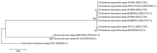 The phylogenetic tree based on ITS sequences of the 2 Trichoderma spp. compared to closely related strains in the GenBank database. The bold data are the names of the strains Trichoderma asperellum TP-B01, Trichoderma harzianum TP-B08, Trichoderma harzianum TP-B09, and Trichoderma asperellum TP-C25 along with the accession numbers of each species. The bootstrap analysis percentage level of 1000 iterations is specified at each node. Bar 0.05 substitutions for each nucleotide position. The strain Sclerotinia sclerotiorum strain SYF (JQ80621.1) is used as an outgroup strain. The accession numbers of the GenBank sequences are specified in parentheses.