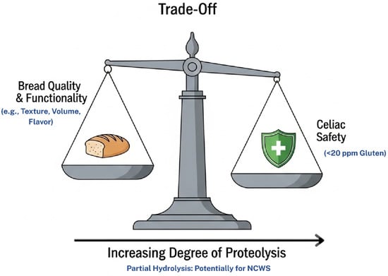 A conceptual model illustrating the trade-off between bread quality and celiac safety during sourdough fermentation. As the degree of proteolysis increases to break down immunogenic gluten peptides (<20 ppm), it often compromises the technological functionality and sensory attributes (e.g., texture, volume) of the bread.