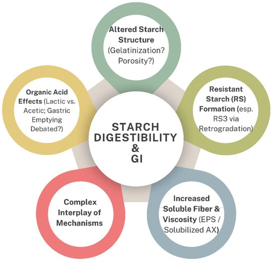 Another benefit of sourdough fermentation is its ability to reduce bread’s glycemic index (GI) through multiple biochemical and structural mechanisms [22]. Compared to conventional white bread (GI ≈ 75), sourdough wheat bread often exhibits a lower GI (≈54) due to fermentation-induced changes in starch digestibility [22,113,114]. However, the underlying mechanisms are complex, multifactorial, and their relative contributions are still debated (Figure 3) [20].
