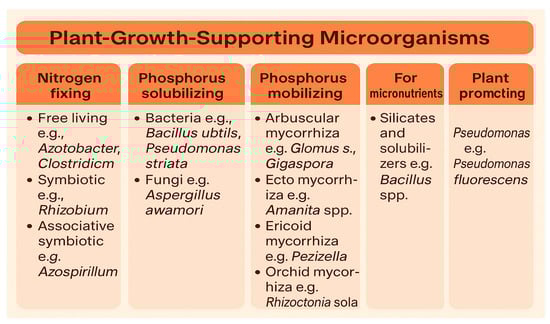 The source of phosphorus in biofertilizers is often ash and bones, and microorganisms, e.g., Bacillus megaterium [3,40], are used for its solubilization. For example, the only high-quality bacterial soil preparation on the Polish market, which enriches the soil with easily assimilable phosphorus from the decomposition of complex and insoluble forms, enhancing plant growth, is based on a single, carefully selected strain of Bacillus megaterium spp. phosphatic bacteria. Fungal biopreparations, e.g., Nod, support plant growth and protect them against pathogens. Thanks to this, it is possible to increase the efficiency of legume cultivation, reduce the intensity of synthetic nitrogen fertilization, and protect crops against pathogens in a sustainable way [43]. A novelty in this field is research on the use of endophytic fungi other than mycorrhizal fungi, which can also affect the availability of phosphorus and potassium, as well as plant resistance [44].