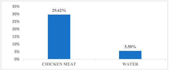 Of the total 216 samples cultured, 38 were positive for the presence of Salmonella, giving an overall prevalence of 17.59% (38/216). Out of the total samples, 29.62% (32/108) and 5.5% (06/108) were positive for meat and water samples, respectively (Figure 1). A chi-square test revealed a statistically significant association between sample type and Salmonella presence (χ2 = 21.58, p < 0.001), indicating that meat samples were significantly more likely to be contaminated than water samples. Out of the 54 retail meat shops sampled, chicken meat samples from 24 shops (44.4%) tested positive for Salmonella, while water samples from 4 shops (7.4%) were positive.