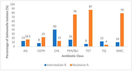 The resistance profile of Salmonella isolates, grouped by antibiotic class, revealed the highest resistance to tetracyclines (TET), with 87% of isolates showing resistance and 6% intermediate susceptibility. This was followed by macrolides (MACs) and penicillin/beta-lactamase inhibitors (PEN/BLIs), with resistance rates of 79% and 76%, respectively. Cephalosporins (CEPHs) showed a moderate resistance level of 22%, with 8% intermediate. Aminoglycosides (AGs) exhibited 16.5% resistance and 13% intermediate susceptibility. Chloramphenicol (CHL) had 13% resistance but a high intermediate rate of 40%, suggesting possible emerging resistance. The lowest resistance was observed against fluoroquinolones (FQs), with only 4% resistance and 12% intermediate susceptibility (Figure 2).