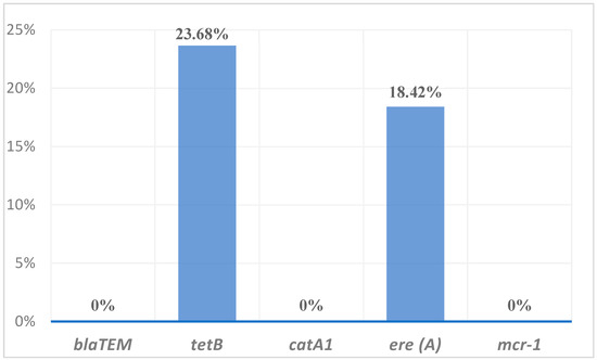 Out of 42 isolates of Salmonella confirmed by biochemical tests, only 38 isolates were revived during culture on nutrient Agar and were subjected to the multiplex PCR technique for the detection of antibiotic resistance genes. tetB and ere(A) genes were detected in nine (23.68%) and seven (18.42%) isolates, respectively. However, mcr-1, catA1, and blaTEM genes were not detected (Figure 3 and Figure 4).