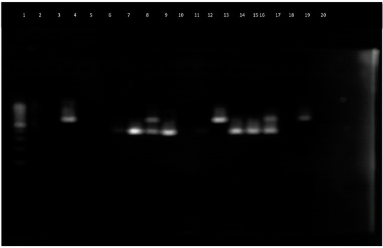 Detection of antibiotic resistance genes in revived Salmonella isolates (n = 38) using multiplex PCR. A representative agarose gel electrophoresis image of the PCR amplicons is shown. Lane 1: 100 bp ladder. Lane 4, 8, 9, 10, 13, 14, 15, 16, 18: positive isolates. Lane 2, 3, 5, 6, 7, 11, 12, 17, 20: negative isolates.