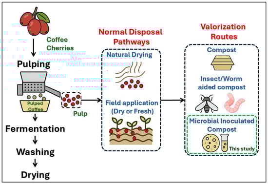 Estimates suggest that, for every metric ton of fresh coffee cherries processed through the wet method, approximately 400 to 500 kg of wet pulp are generated as a direct byproduct [4,28,29]. This pulp is a lignocellulosic biomass composed primarily of water, structural polysaccharides including pectin, cellulose, and hemicellulose, and a variety of soluble compounds such as sugars, organic acids, caffeine, and phenolic substances [9,30]. While these compounds confer nutritional and biochemical value, they also pose ecological risks when released into the environment without appropriate treatment [4,9,15]. The high biochemical oxygen demand (BOD) and phytotoxic potential of untreated pulp leachate can negatively impact soil microbial communities, contaminate freshwater systems, and inhibit plant growth in surrounding ecosystems [31,32,33]. Although certain processing residues, such as coffee husks and trunks, have received attention for energy recovery through thermochemical conversion [34,35,36], or as low-cost feedstock for biochar production [37], the valorization of coffee pulp remains limited in both scope and application [4]. In most coffee-producing regions, pulp is either discarded in unregulated open-air systems or subjected to traditional composting practices with minimal control over key physicochemical parameters [38,39]. These methods are often inefficient, and alternative strategies such as black soldier fly (BSF) or vermicomposting have shown promise [40,41]. However, both approaches face limitations, including incomplete stabilization of the substrate in BSF systems and earthworm mortality during the thermophilic phase of composting [38]. As a result, there is a need for optimized microbial-based solutions to ensure efficient, safe, and agronomically valuable pulp management (Figure 1).