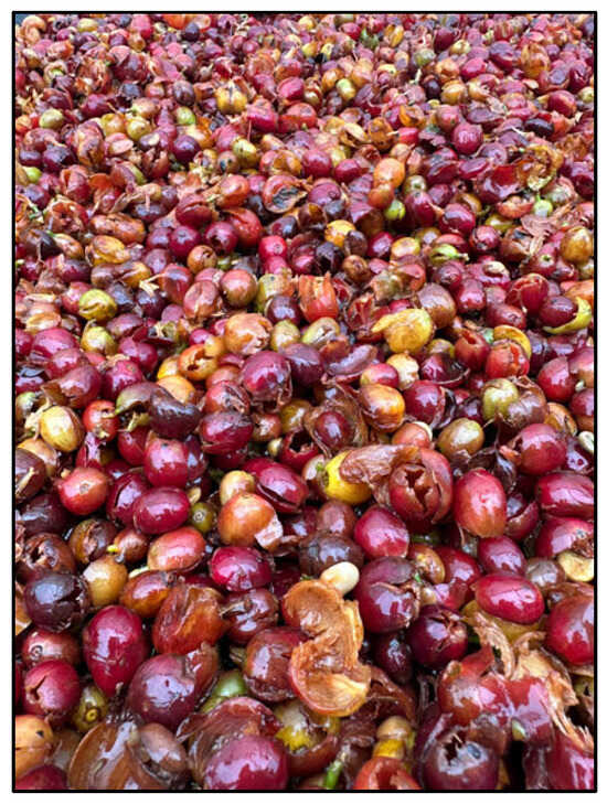 Coffee (Coffea spp.) is a globally significant crop, both economically and socially, with millions of livelihoods dependent on its cultivation, processing, and export [1,2,3,4]. As one of the most traded agricultural commodities worldwide, coffee drives rural development and foreign exchange earnings in many tropical countries [3,5]. However, the postharvest transformation of coffee cherries into green beans, particularly through the wet-processing method widely applied to Coffea arabica L., involves a sequence of mechanized and water-intensive operations that generate substantial quantities of agro-industrial residues [6,7,8,9]. These include pulp, mucilage, wastewater, and, to a lesser extent, husk and silverskin during later processing stages [7,10,11]. Among these byproducts, coffee pulp, which consists of the outer skin (exocarp) and fleshy layer (mesocarp) removed during the pulping stage, is the most abundant solid residue, often accounting for more than 40–50% of the fresh fruit mass [4,12]. Its generation is therefore directly proportional to global coffee production, which surpasses 10 million tons annually [13,14]. While the economic importance of coffee is well acknowledged, its processing footprint introduces a range of environmental challenges, particularly due to the inadequate valorization of lignocellulosic biomass [4,15]. If not properly managed, these residues contribute to water pollution, greenhouse gas emissions, and local soil degradation, highlighting the need for sustainable and circular approaches to postharvest waste management [15,16,17].
