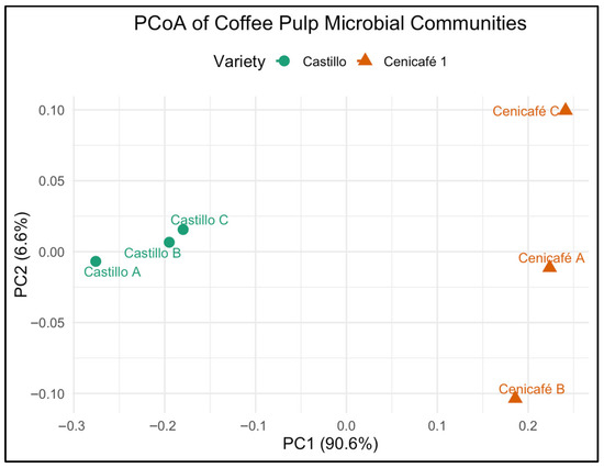 PCoA revealed a clear separation between microbial communities from the pulp of Coffea arabica L. var. Castillo and var. Cenicafé 1 (Figure 4). The first principal coordinate (PC1), accounting for 90.6% of the variation, distinctly discriminated between the two varieties, indicating that genotype-specific pulp chemistry or fermentation microenvironments significantly shaped microbial assembly.