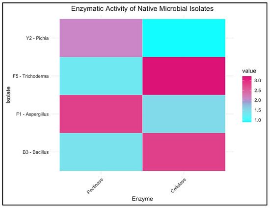 The enzymatic screening of representative microbial isolates revealed diverse functional profiles relevant to organic matter degradation. As summarized in Table 3, Aspergillus niger (F1) and Pichia kudriavzevii (Y2) displayed high pectinolytic activity, with pectinolytic index values of 2.8 and 2.1, respectively. These isolates were recovered from the Cenicafé 1 and Castillo pulps, underscoring the presence of functionally specialized yeasts and filamentous fungi in both varieties.
