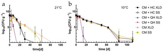 Without treatment, Salmonella survived in the approach until the end of sampling at 10 °C and for at least 80 days at 21 °C. Salmonella species are known to survive in stored slurries and dirty waters for up to three months and for less than one month in solid manure heaps with temperatures greater than 55 °C [43]. The survival rate of S. Ty. depends on pH and medium composition, the chain length of the acid, and the concentration of VFAs and temperature [24].