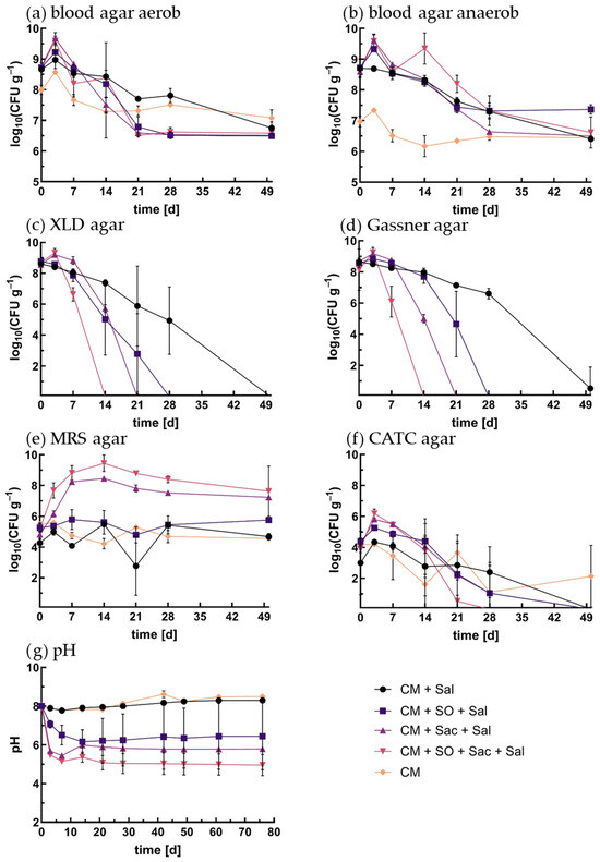 Results of Exp2 CFU/g of microbial community in log10 at 21 °C: (a) blood agar incubated under aerobic conditions, (b) blood agar incubated under anaerobic conditions, (c) XLD agar, (d) Gassner agar, (e) MRS agar, (f) CATC agar, (g) pH. Abrev.: CM—cattle manure; Sal—S. Ty.; SO—squeezed oat; Sac—saccharose.