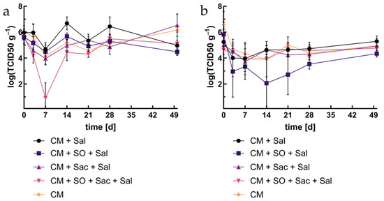 For the enumeration of sulfite-reducing anaerobes, like Clostridium spp. and their spores, DRCM bouillon was used. In all approaches, the minimum was observed after seven days (Figure 3). OA showed a minimum of log 1 TCID50/mL, while in the other approach, minimum values between log 4 and 5 TCID50/mL were measured. Afterwards, the values rose to the previous level. The highest values were measured in CHO-A, whereas the other approaches showed no significant difference.