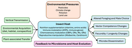 The insect microbiome has emerged as a central driver of host physiology, behavior, and ecological interactions, influencing processes as diverse as nutrient assimilation, immune regulation, reproductive strategies, chemosensory perception, and vector competence (Figure 3) [1,3,34,73]. These microbial communities do not function in isolation; they are shaped by an interplay of host genetics, environmental reservoirs, diet, and interspecific interactions, creating feedback loops that extend beyond individual hosts [2,3]. In doing so, they exert influence not only on individual fitness but also on population-level dynamics, trophic networks, and the epidemiology of vector-borne diseases [3,15,22].