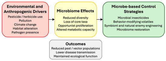 Environmental drivers and microbe-based control strategies. Environmental pressures disrupt insect microbiomes by altering acquisition pathways, microbial diversity, and functional traits. Understanding these shifts enables the development of targeted, microbe-based control strategies, including microbial insecticides, behavior-modifying volatiles, and engineered symbionts.
