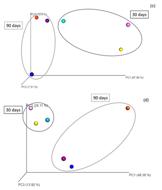 T0: initial time; T1: 30 days; T2: 60 days; T3: 90 days; NA: natural attenuation; BA: bioaugmentation with fresh beads; LA: bioaugmentation with lyophilized beads; (a) Euclidean distance representation of beta diversity at the genus level of the NA, BA and LA treatments; (b) Bray–Curtis distance representation of beta diversity at the genus level of the NA, BA and LA treatments; (c) Euclidean distance representation of beta diversity at the genus level of the NA, L and LB treatments; (d) Bray–Curtis distance representation of beta diversity at the genus level of the NA, L and LB treatments. Light, middle and darker intensity colors represent the diversity at 30 days, 60 days and 90 days, respectively. In this case the Principal Coordinate Analysis shows significant clustering for the different treatments.