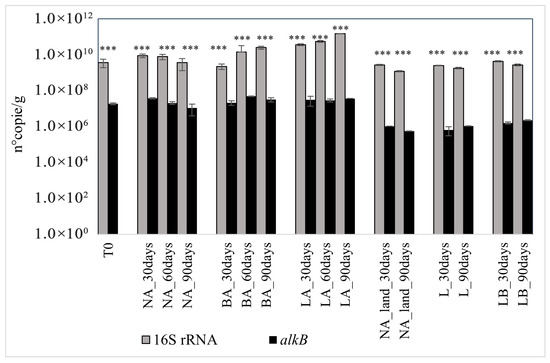 16S rRNA and alkB gene copies in the different treatments over time. NA: natural attenuation; BA: fresh alginate beads; LA: lyophilized beads; NA_land: natural attenuation of landfarming; L: landfarming; LB: landfarming + bioaugmentation. The *** mark indicates significant differences observed in the ratio alkB/16S rRNA (p < 0.001 ***).
