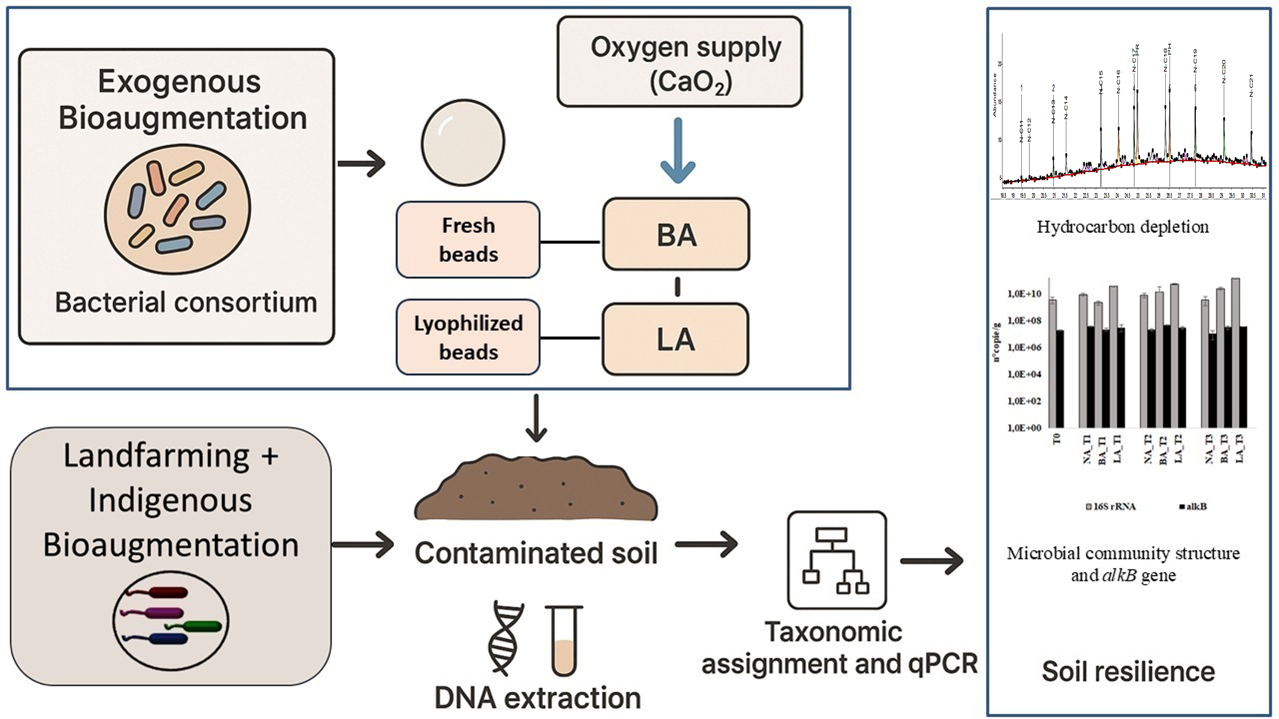 - Here, the bacterial strains were isolated from oil-contaminated soils in Equatorial and Mediterranean climates. Their selection was guided by criteria focused on the degradation of aliphatic hydrocarbons typical of recent contamination events (3 months in this study). To this end, candidate strains were chosen based on the presence of the alkB gene, the chosen molecular marker, and the ability to produce biosurfactants. The strains were subsequently entrapped in alginate beads, and calcium peroxide, the chosen ORC, was added to ensure sustained aerobic conditions. To assess field-readiness, the entrapped bacterial consortium was also tested as a lyophilized formulation.