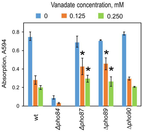 Vanadate inhibits the growth of yeast cells [36]. In this regard, vanadate compounds have been proposed as fungicides; for example, the β-AgVO3 gel showed physicochemical stability and antifungal activity [37]. Vanadate ions inhibit the activity of plasma membrane proton ATPase [38]. Phosphate is a competitive inhibitor of vanadate uptake, and vanadate is a competitive inhibitor of phosphate uptake [39]. It is known that in O. parapolymorpha, inactivation of the PHO87 gene leads to increased resistance to vanadate [40]. In this regard, we tested the effects of knockouts of the genes encoding phosphate transporters of S. cerevisiae on yeast growth in the presence of different concentrations of vanadate.