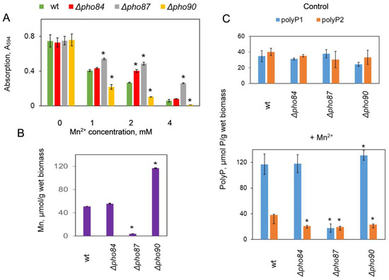 The biomass samples from the cultures grown in the presence of 2 mM Mn2+ were obtained using the same cultivation conditions and time of cultivation as for the polyP assay. Biomass samples were obtained by cultivation for 24 h in control YPD. In the YPD with manganese, the stationary growth phase was reached in various periods for strains under study: 4 days for the wt strain and 3, 3, and 6 days for the strains ∆pho87, ∆pho84, and ∆pho90, respectively. To compare the manganese content, we used the quantities of manganese normalized to sample masses (µmol Mn/g of wet biomass). The wet biomass samples were standardized using the same centrifugation conditions, 5000× g for 15 min, as in [35].