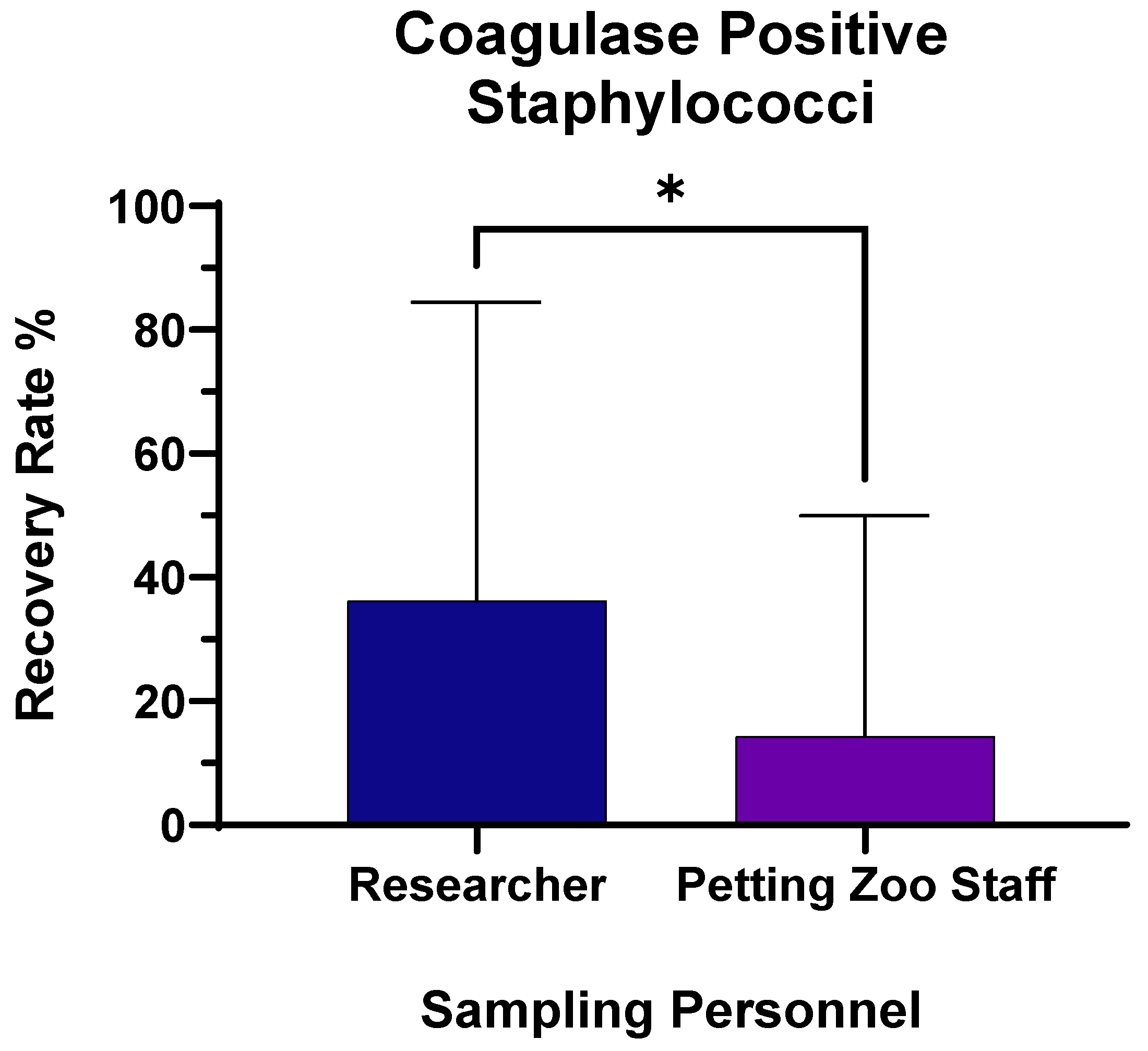Figure 2. Recovery of coagulase positive staphylococci from skin swabs of mammals at petting zoos (n = 166), collected by the researcher (n = 147) versus petting zoo staff (n = 19); * denotes significance (p ≤ 0.05).