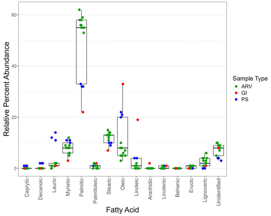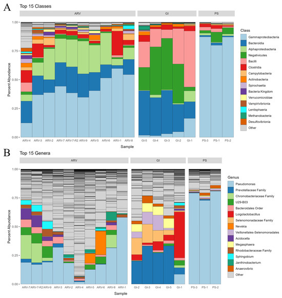 The microbial community composition (Figure 2, Supplementary Table S10) was analyzed, and when visualized by Class, it showed that PS samples were dominated by the Gammaproteobacteria, which were more abundant than in other sample types (Figure 2A). The GI samples had a low abundance of Gammaproteobacteria and higher abundances of Bacteroidia, Negativacutes, and Bacilli compared to the other samples. The ARV samples had the highest abundance of Clostridia and Alphaproteobacteria. They also contained more Bacteroidia and Gammaproteobacteria than the PS samples, but less than the GI samples. At the genus level (Figure 2B), Pseudomonas, a Gammaproteobacteria known for its role in lipid degradation and biofilm formation [34], was abundant in PS samples and to a lesser extent in ARV samples. Anaerobic fermenters including Prevotellaceae and Veillonellales-Seleomonadales were present in PS and GI samples. These anaerobic fermentors are known for short-chain FA production under anaerobic conditions [35,36]. Additionally, Chromobacteriaceae were abundant in some ARV samples, including facultatively anaerobic microbes with lipase activity [37].