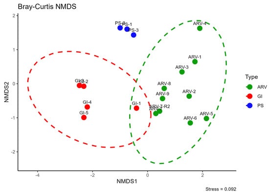 The Bray–Curtis dissimilarity plot of the FOG samples showed that most of the samples within a sample type are grouped closely together and with only partially overlapping ellipses, suggesting that the samples are statistically distinct, especially as neither ellipse incorporates PS samples (Figure 3). However, there is one GI sample, GI-1, that is further from the other GI samples and is closer to the ARV samples. Looking at the microbial community composition data, GI-1 has the most variety compared to the other GI samples, having a smaller abundance of Bacteroidia and Negativicutes with a larger abundance of Bacilli, Gammaproteobacteria, and Alphaproteobacteria (Figure 3). Analysis of similarity (ANOSIM) results of microbial community composition across the three groups, when conducted with 9999 permutations, resulted in an R value of 0.8955 and a significance value of 0.0001. This suggests dissimilarity between groups that is statistically significant. Alpha diversity metrics are shown in Supplementary Table S1. Chao1 and ACE indices for ASV abundance range from 120–594. PS samples were generally lower than ARV samples for Chao1 and ACE indices, and lower than ARV and GI for Shannon Diversity and Simpson Index, indicating lower alpha diversity within PS samples.