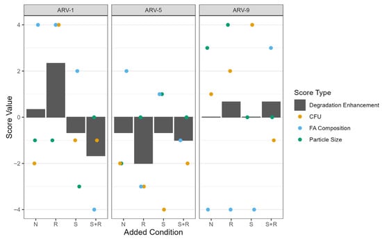 Degradation enhancement scores across different conditions: no shaking nor reapplication (N), reapplication (R), shaking (S), and both shaking and reapplication (S+R). Individual scores used to calculate the degradation enhancement score, including CFU, FA composition, and particle size, are included. Each condition was tested in singlet for three different ARV samples.