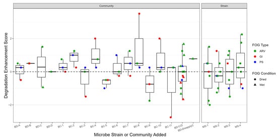 Degradation enhancement scores sorted by microbial strain or community. Degradation enhancement scores for different FOG types and conditions (wet or dry) are included.