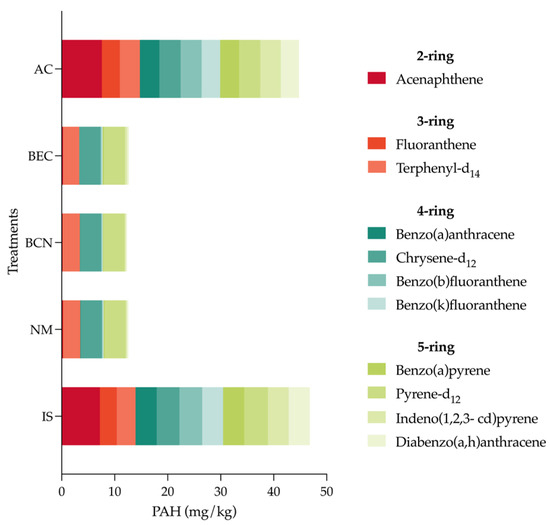 PAHs composition in soil samples. IS = Initial soil, NM = Native microbiota final soil, BNC = Bioaugmentation native consortium final soil, BEC = Bioaugmentation exogenous consortium final soil, AC = Abiotic control final soil.