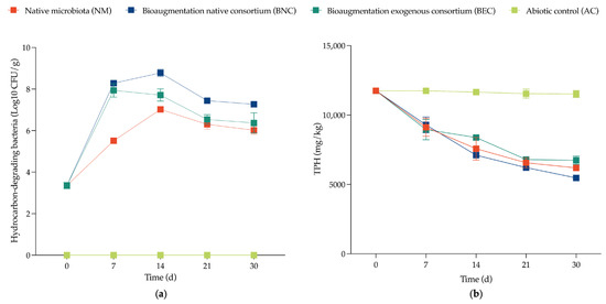 Dynamics of culturable bacterial populations and TPH removal. (a) Abundance of culturable hydrocarbon-degrading bacteria, (b) Changes in TPH concentrations. Pearson correlation results (α = 0.05): NM p = 0.002, r = −0.8207, BNC p = 0.0048, r = −0.6851, BEC p = 0.0120, r = 0.6288.