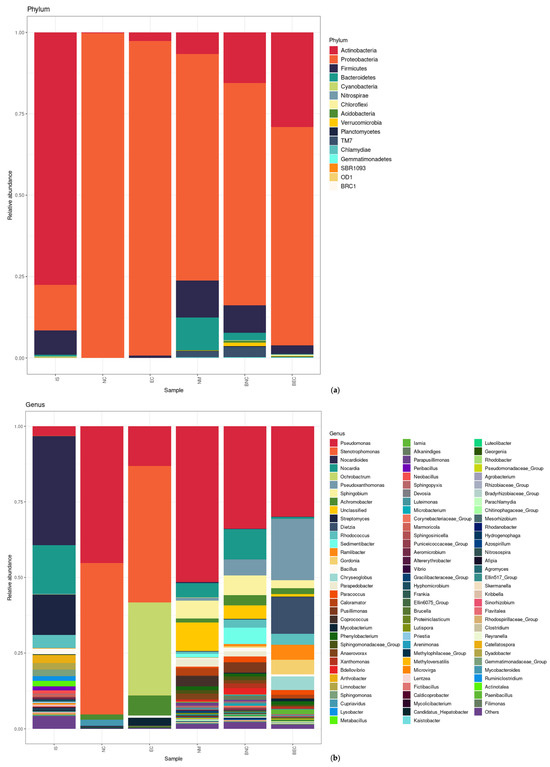 Taxonomic composition, (a) Phylum, (b) Top 100 most abundant bacterial genera across all samples. IS = Initial soil, NC = Native consortium, EC = Exogenous consortium, NM = Native microbiota final soil, BNC = Bioaugmentation native consortium final soil, BEC = Bioaugmentation exogenous consortium final soil.