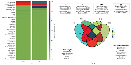 Comparative taxonomic distribution of bacterial genera. (a) Heatmap showing the total genera detected in bacterial consortia. The most abundant genera (>0.05%) are highlighted in bold. (b) Venn diagram illustrating the 30 predominant genera in soil samples. The five most abundant genera are shown, as well as the genera shared among the bioremediated soils and across all soil samples. IS = Initial soil, NC = Native consortium, EC = Exogenous consortium, NM = Native microbiota final soil, BNC = Bioaugmentation native consortium final soil, BEC = Bioaugmentation exogenous consortium final soil.