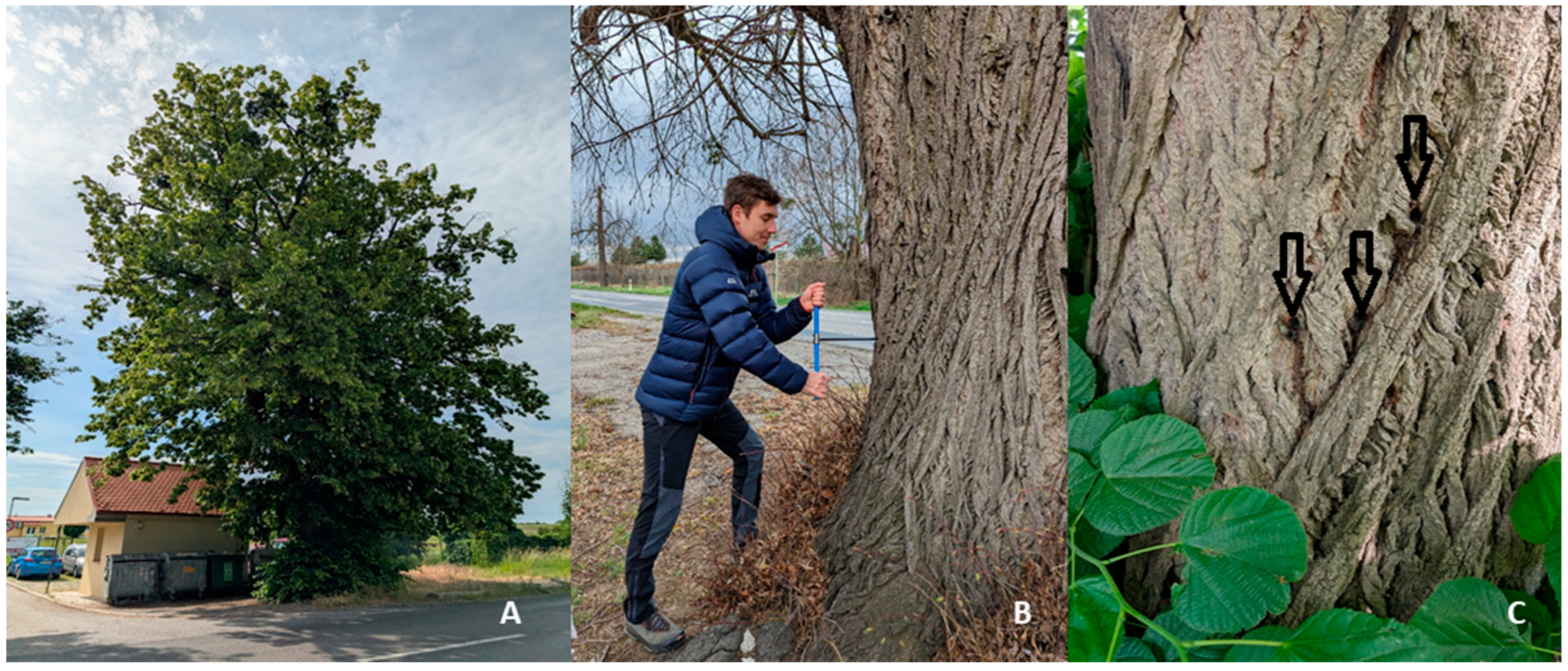 - Tomiczek, C.; Diminić, D.; Cech, T.; Hrašovec, B.; Krehan, H.; Pernek, M.; Perny, B. Pests and Diseases of Urban Trees; Šumarski Institute: Zagreb, Croatia; Šumarski Fakultet Sveučilišta u Zagrebu: Jastrebarsko, Croatia, 2008; p. 370. [Google Scholar]