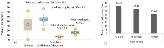 Descriptive statistics of (a) mycorrhization, collar diameter, seedling height, and root length of C. avellana (47 seedlings), and (b) mean of mycorrhization by root length from stem collar.