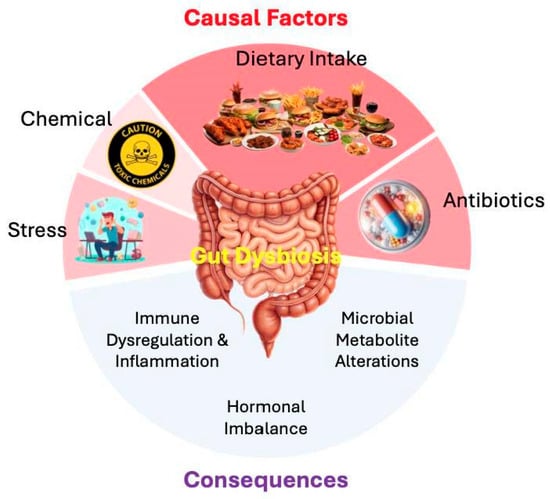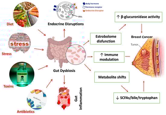 The human gut microbiota, a complex and dynamic microbial ecosystem, plays a crucial role in numerous physiological functions, including nutrient metabolism, immune regulation, and endocrine signaling. Its balance and diversity are critical for sustaining host health. However, when the composition, density, or functionality of the microbiota becomes disrupted, a condition termed “dysbiosis” arises. Gut dysbiosis reflects a pathological imbalance in the microbial community, and growing evidence implicates it as a key contributor to a broad spectrum of chronic diseases, including metabolic syndrome, autoimmune conditions, neurodegenerative disorders, and various cancers, notably breast cancer [50,51].