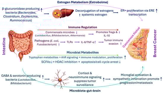 In contrast, others, including secondary bile acids and lipopolysaccharides (LPS), may promote tumorigenesis under dysbiosis conditions [22,23]. Specific to breast cancer, mechanistic links have been proposed through the estrobolome, gut-associated immune responses, and microbial metabolites that influence cellular proliferation, DNA damage, angiogenesis, and apoptosis [24]. Additionally, the microbiota-gut–brain axis is emerging as a potential modulator of stress responses and neuroimmune interactions that may indirectly influence tumor progression and metastasis.