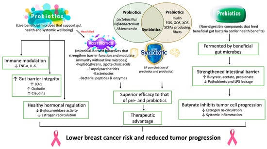 Probiotic, prebiotic, and synbiotic interventions targeting the gut–breast axis: mechanisms and therapeutic advantages in breast cancer prevention and management. Probiotics (e.g., Lactobacillus, Bifidobacterium, Akkermansia) and prebiotics (e.g., inulin, FOS, GOS, XOS, SCFA-producing fibers) modulate gut microbial composition and function, thereby improving hormonal homeostasis and restoring immune regulatory balance. Prebiotic substrates are selectively fermented by beneficial microbes, thereby increasing the production of short-chain fatty acids (butyrate, acetate, propionate) and reducing intestinal permeability, LPS leakage, and pathobiont expansion. Synbiotics, which combine live beneficial microbes with targeted fermentable substrates, exhibit superior efficacy by enhancing microbial engraftment, SCFA yield, and gut barrier fortification. Butyrate, a major microbial metabolite, exerts direct anticancer effects by suppressing estrogen re-circulation, inhibiting tumor cell proliferation, and attenuating systemic inflammation. By synergistically modulating the microbiota–immune–endocrine axis, these microbiome-directed therapies offer a promising therapeutic advantage for breast cancer prevention, disease progression control, and optimization of treatment response.