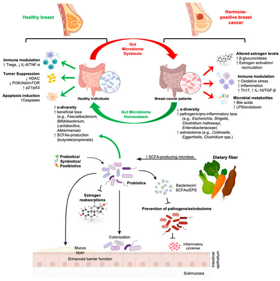 A follow-up clinical intervention explored the effects of a plant-based, high-fiber diet in breast cancer survivors [273,277]. Participants experienced significant increases in the relative abundance of F. prausnitzii and A. muciniphila, along with improvements in urinary estrogen metabolite ratios (i.e., increased 2-OHE1:16α-OHE1), suggesting enhanced estrogen detoxification capacity and favorable shifts in host-microbiota interactions [145,277,278]. Extending beyond probiotics and diet, recent trials have explored the impact of synbiotic formulations. A double-blind, randomized controlled trial by Khazaei et al. (2023) investigated the effects of multiple Lactobacillus species in postmenopausal breast cancer patients during a 12-week intervention [207]. Recent interventional studies using symbiotic formulations, including multi-species Lactobacillus consortia, demonstrated increased microbial alpha-diversity, enrichment of SCFAs-producing taxa, and elevated circulating or fecal levels of butyrate and propionate [279]. The synbiotic group showed significant improvements in microbial diversity and butyrate production, along with enhanced patient-reported outcomes, including reduced fatigue and improved quality of life [207]. Although oncologic endpoints (e.g., tumor progression or recurrence) were not directly assessed, the observed immune-metabolic benefits underscore the potential for synbiotics as supportive interventions during survivorship and therapy [207]. These metabolic shifts correlate with reduced inflammatory markers and immune modulation in breast cancer survivors and related oncology cohorts [207]. Improvements in patient-reported outcomes, including fatigue, sleep quality, gastrointestinal comfort, and overall quality of life, have also been reported following synbiotic or probiotic interventions [213,280]. Currently, no clinical trials have evaluated the direct administration of postbiotics in the treatment of breast cancer. However, observational studies suggest that reduced levels of SCFAs, particularly butyrate and propionate, are characteristic of the breast cancer microbiome [214,281]. A prospective study further demonstrated that fecal microbiota signatures predictive of butyrate production correlated inversely with systemic inflammation and circulating hormone levels associated with oncogenesis [21,129,282]. These data suggest that postbiotic restoration, whether through diet, probiotics, or direct supplementation, is a promising but underexplored therapeutic avenue. A detailed schematic representation of how the gut microbiome helps maintain a healthy breast and how its imbalance contributes to hormone-positive breast cancer is shown in Figure 5.