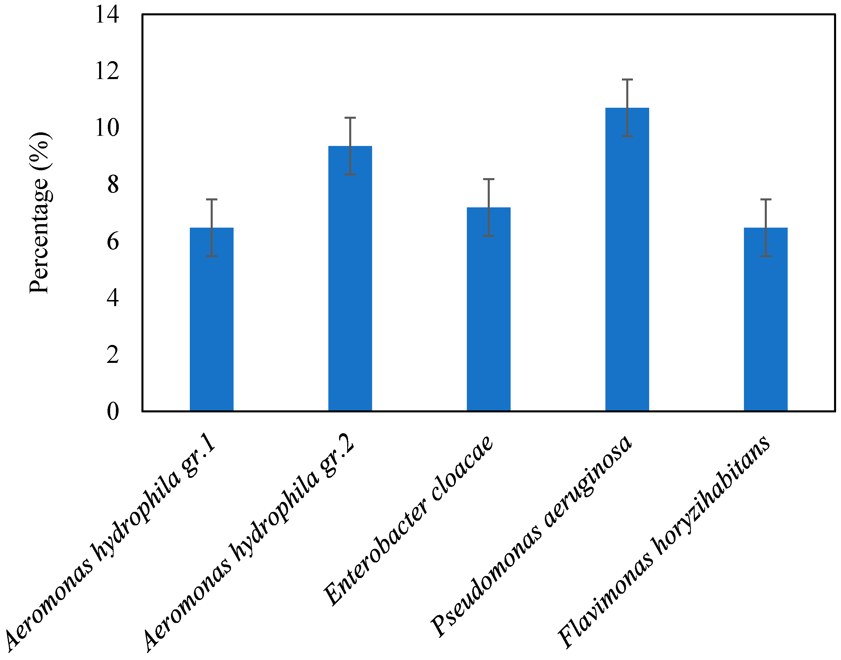 | Well 4 | Aeromonas hydrophila gr.1; Aeromonas hydrophila gr.2; Pseudomonas aeruginosa; Flavimonas horyzihabitans; Pseudomonas fluorescens; Enterobacter amnigenus 2; Klebsiella ornithinolytica; Photobacterium damsela; Serratia liquefaciens; Stenotrophomonas maltophilia; Acinetobacter baumannii; Enterobacter sakazakii; Providencia rettgeri; Pseudomonas horyzihabitans | Aeromonas hydrophila gr.1; Aeromonas hydrophila gr.2; Enterobacter cloacae; Escherichia coli (type 1); Flavimonas horyzihabitans; Enterobacter amnigenus 2; Pseudomonas fluorescens; Citrobacter freundii; Comamonas testosteroni; Klebsiella ornithinolytica; Photobacterium damsela; Serratia liquefaciens; Stenotrophomonas maltophilia; Aeromonas salmonicida; Enterobacter aerogenes; Raoultella ornithinolytica; Serratia marcescens |