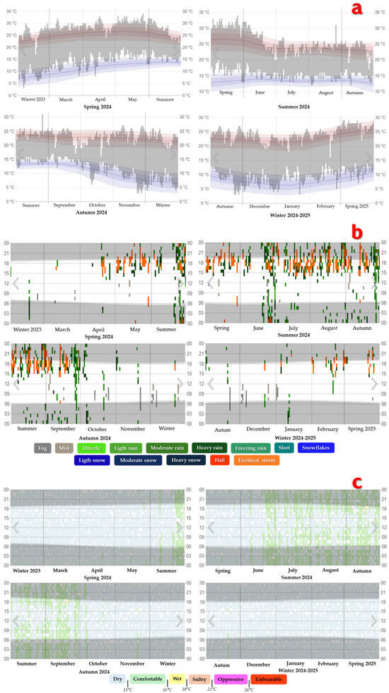 Figure 1b shows the precipitation levels for Texcoco de Mora, Mexico, during the four seasons of the period 2024–2025, where the observed time per hour is color-coded according to the category in order of intensity, while Figure 1c presents the humidity levels during the same seasons of the 2024–2025 period. In this subsection it can be seen that the criterion used to classify the humidity level was the recorded daily dew point. The gray stripes indicate the period corresponding to the night and civil twilight.